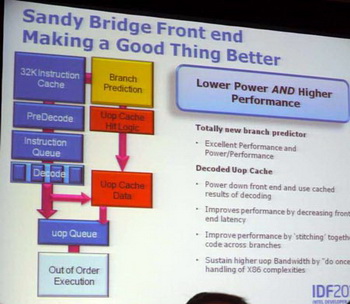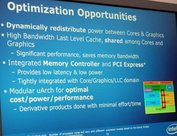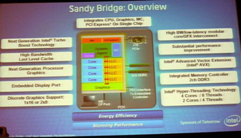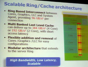 One of the primary tasks, which stood before Intel engineers with the development of sandy bridge design, there was to integrate graphic core in one crystal with the processor. For this reason graphic core was completely rebuild-ed and from the processor design side it is simply some more processor core. For connection and interaction of processor core, graphic core and caches is created the new internal bus ring, which works at the fixed frequency : 3 GHz.