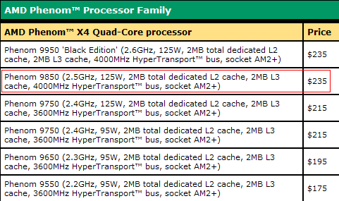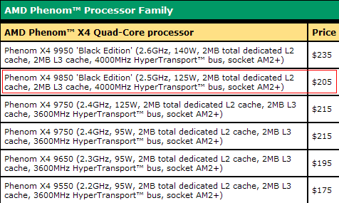 Now the Phenom X4 9850 (2.5 GHz) Black edition, cost the promised $205. Related Products :